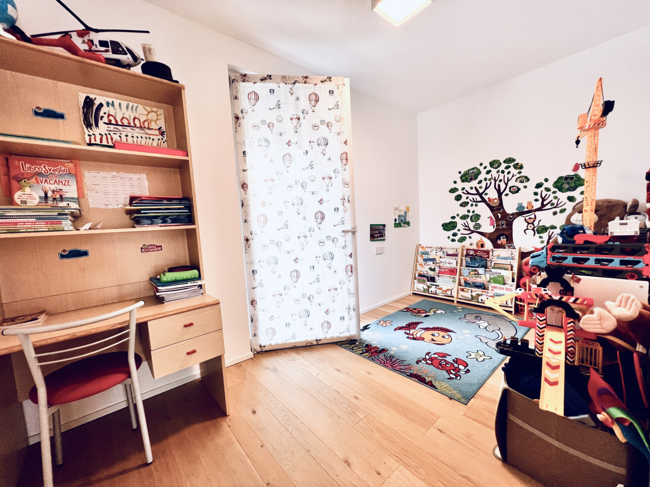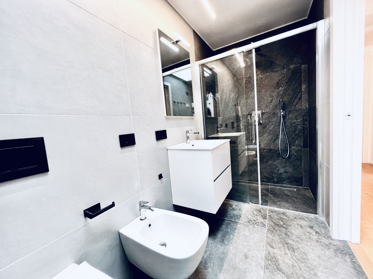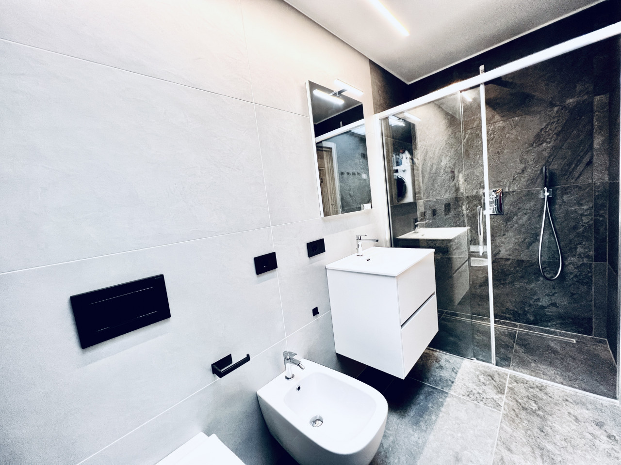 La zona notte, sapientemente distribuita, comprende tre camere da letto: una matrimoniale, una doppia con terrazzo privato e una singola con ulteriore terrazzo, oltre a due bagni finestrati con doccia, realizzati con materiali e dettagli di pregio.