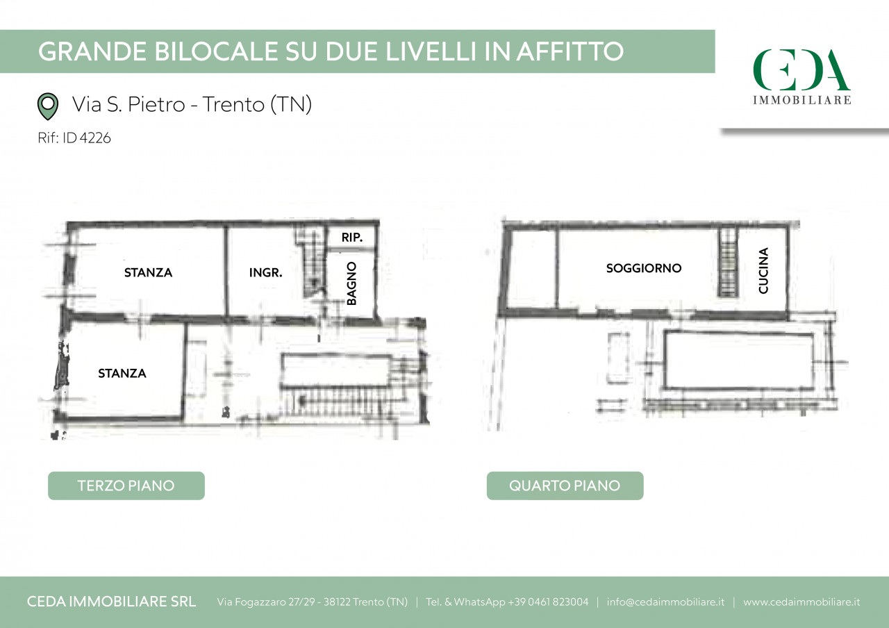 Proponiamo in affitto in centro storico a Trento, grande trilocale arredato e disposto su due livelli in palazzo storico.