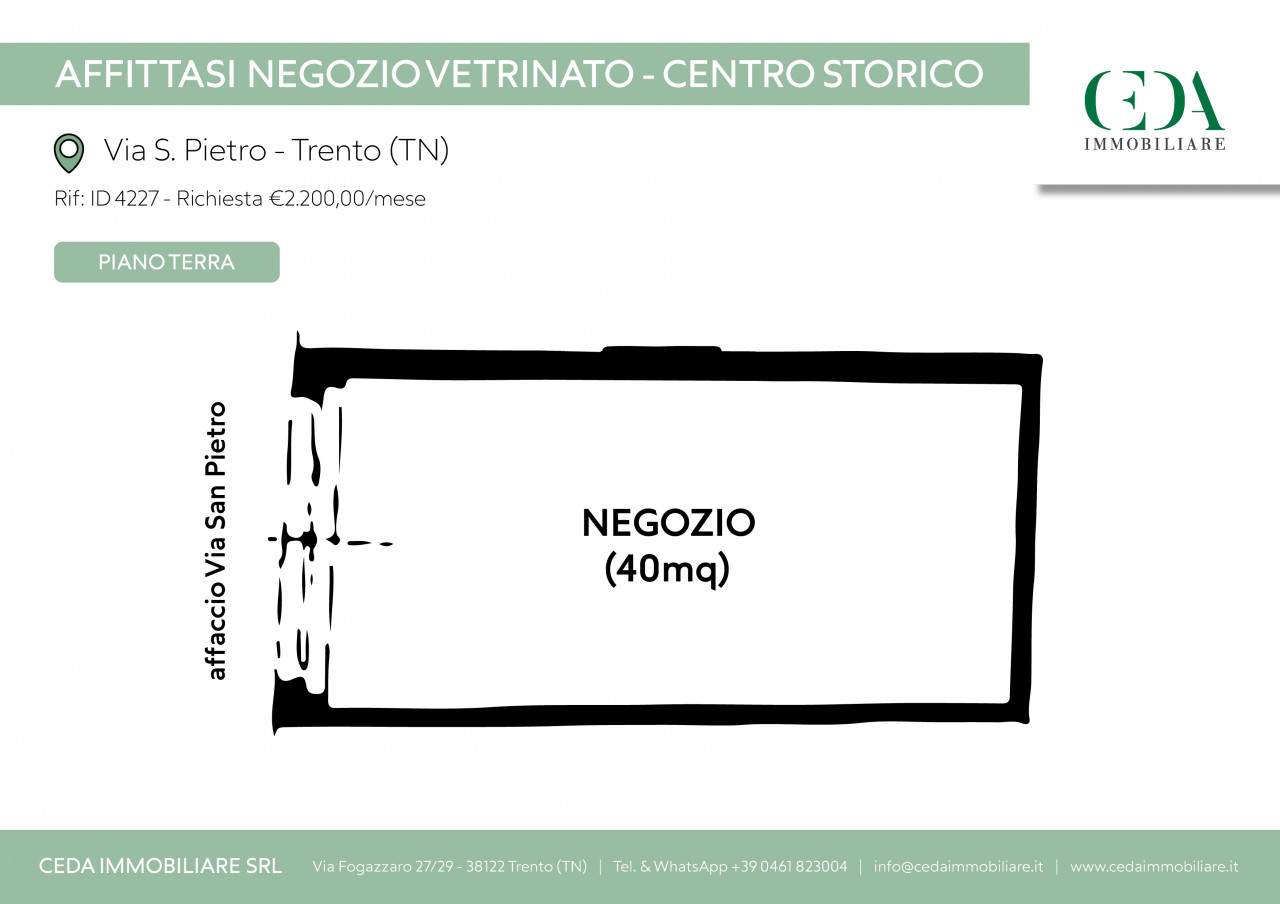 Proponiamo in affitto in pieno centro storico, Via San Pietro, negozio a piano strada con vetrina.