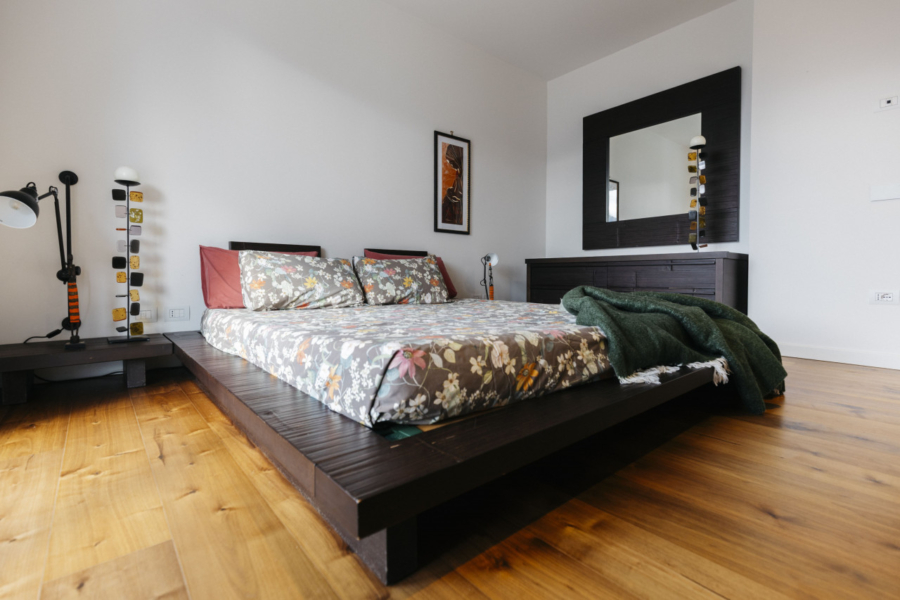 Al piano primo si sviluppa la zona notte, composta attualmente da due ampie camere da letto e due bagni finestrati. La progettazione originaria ha tuttavia previsto la possibilità di realizzare una terza camera da letto, semplicemente mediante la creazione di una tramezza nell’attuale guardaroba finestrato, già dimensionato e predisposto a tale funzione. Le camere godono dell’accesso a una splendida terrazza panoramica, raggiungibile anche tramite scala esterna dal giardino.