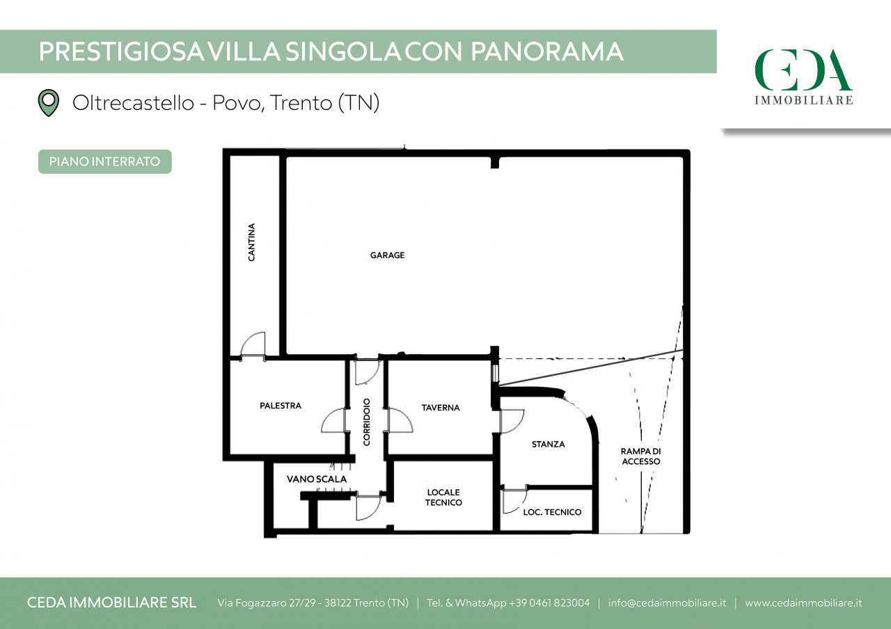 Il piano interrato ospita un grande garage di circa 100 mq, dotato di lucernario e accesso diretto tramite portoncino blindato. Su questo livello troviamo inoltre una spaziosa taverna, facilmente adattabile a zona ospiti o alloggio per personale di servizio grazie alla presenza di stanza e bagno dedicati. Completano il piano una cantina, il locale tecnico e un ulteriore ambiente predisposto per la realizzazione di una sauna, attualmente utilizzato come palestra.