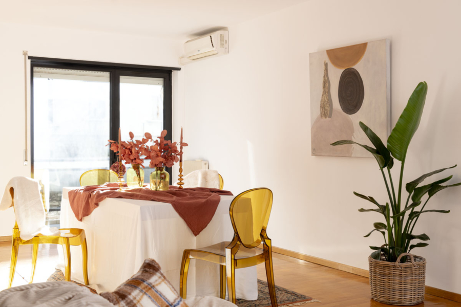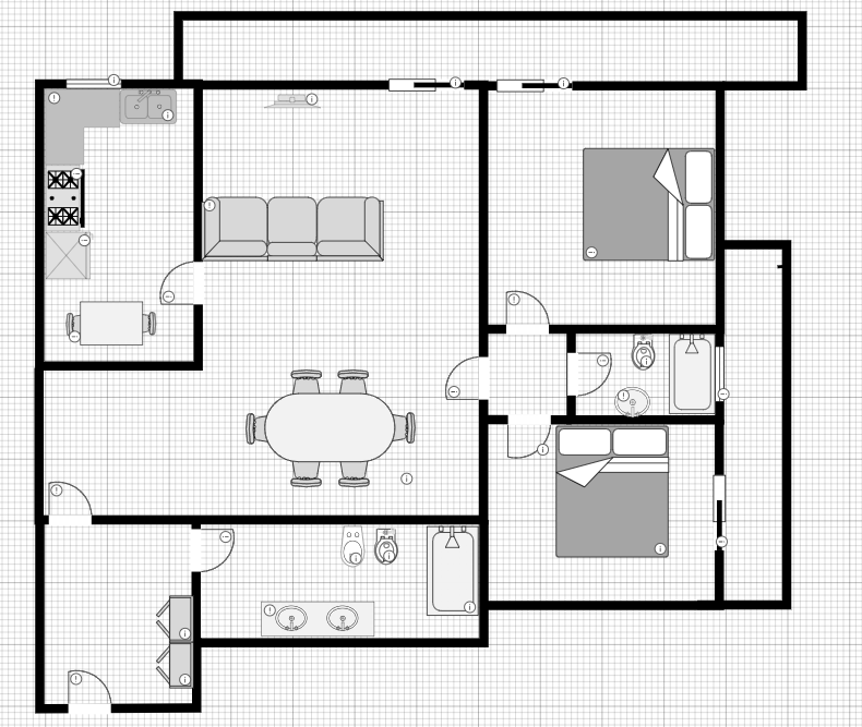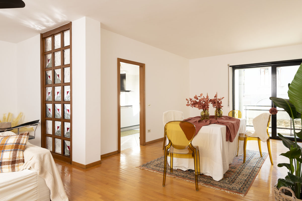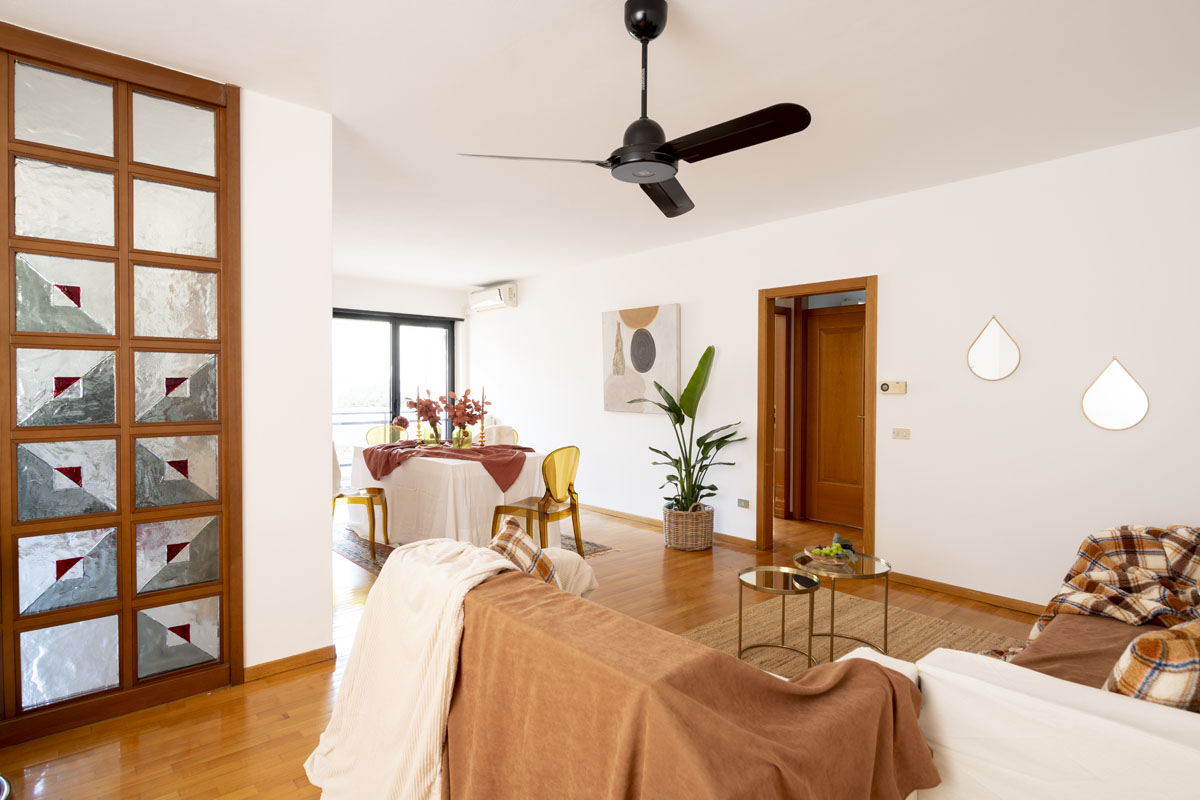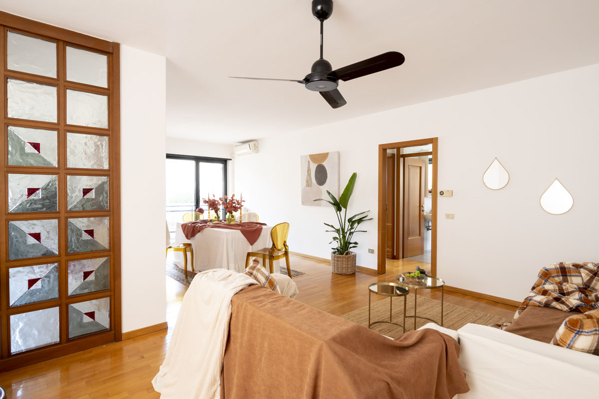 L’appartamento è composto da una grande zona giorno, cucina separata, due camere matrimoniali e doppi servizi oltre a due balconi.