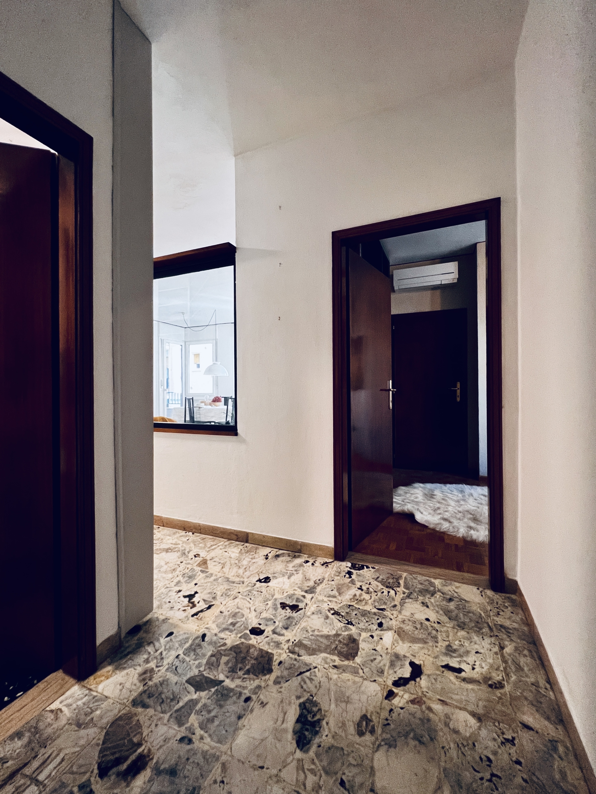 L’abitazione si distingue per la particolare distribuzione degli spazi e per la luminosità garantita dall’esposizione a sud. La zona giorno comprende un ampio soggiorno con balcone coperto, un pratico ripostiglio ed una cucina abitabile separata, anch’essa servita da un comodo balcone. La zona notte è composta da due camere da letto, bagno finestrato, ripostiglio e un ulteriore locale attualmente adibito a guardaroba, facilmente trasformabile in terza camera con bagno finestrato annesso e accesso al terzo balcone coperto.